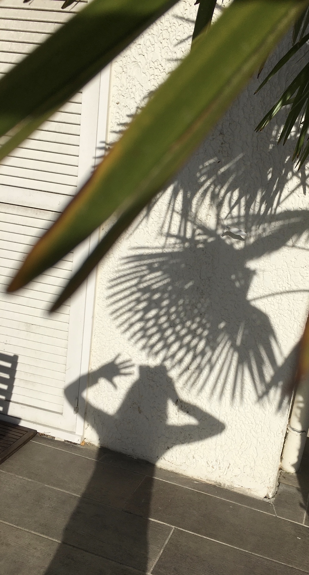 Entre les palmes de mes doigts L’ombre qui projette son aura Sur le mur blanc et les claustras Qui enlace la chaux de mes bras