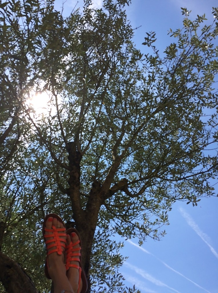 Je suis Allongée jambes étirées sous le bel olivier de soleil irradié