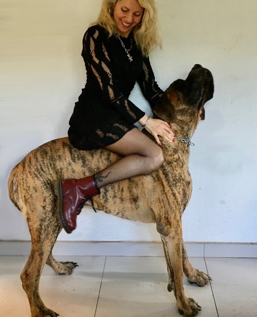 Fascinant Dogue allemand Environ : 92 cm au garrot environ 85/90 km. Très fragile comme tous les très très grands chiens La taille d’un beau tigre, avec un pelage fauve tigré…